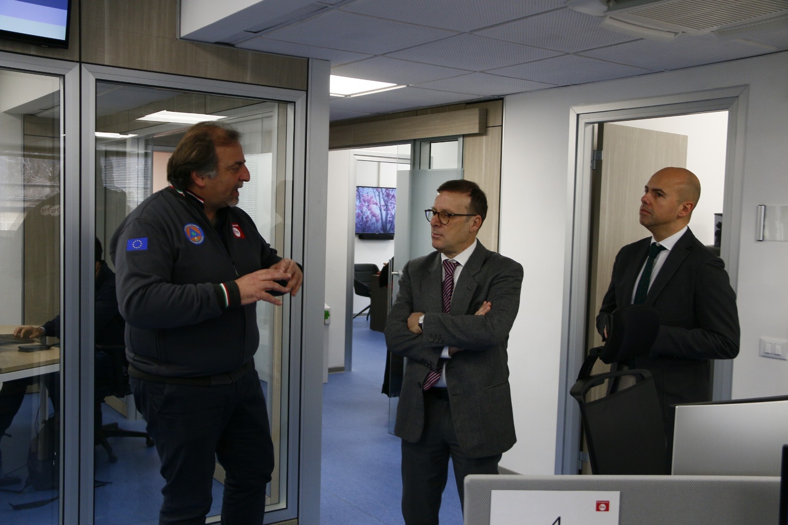 Il Prefetto dell’Aquila Giancarlo Di Vincenzo (al centro della foto), accompagnato dal capo di gabinetto Sergio Di Iorio (a dx), nella mattina odierna ha fatto visita alla Centrale del NUE 1 1 2. A riceverli, Mauro Casinghini (a sn).