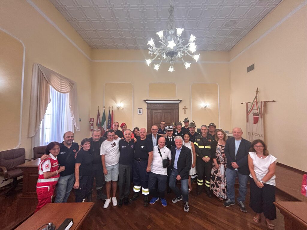 Dopo l’incontro istituzionale, svoltosi nella sala consiliare, Scelli ha ricevuto l’abbraccio affettuoso e simbolico delle associazioni locali di Protezione Civile, della Croce Rossa, del CISOM, dei Vigili del Fuoco e degli Alpini dell’ANA, a testimonianza del legame forte e autentico con il territorio.